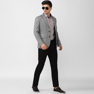 Men Grey Printed Single-Breasted Slim-Fit Formal Blazer