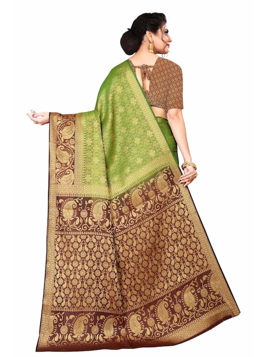 Olive green and brown kanjeevaram saree Woven design saree with woven design border Has zari detail.